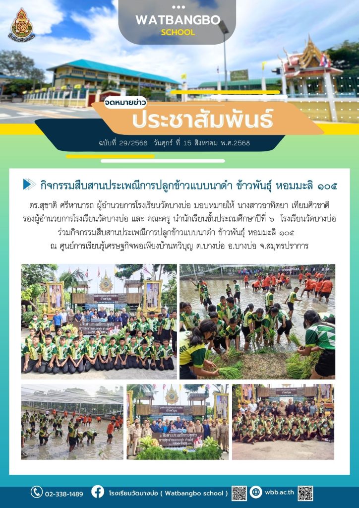 ดร.สุชาติ ศรีหานารถ ผู้อำนวยการโรงเรียนวัดบางบ่อ มอบหมายให้ นางสาวอาทิตยา เทียมศิวชาติรองผู้อำนวยการโรงเรียนวัดบางบ่อ และ คณะครู นำนักเรียนชั้นประถมศึกษาปีที่ ๖ โรงเรียนวัดบางบ่อ ร่วมกิจกรรมสืบสานประเพณีการปลูกข้าวแบบนาดำ ข้าวพันธุ์ หอมมะลิ ๑๐๕ ณ ศูนย์การเรียนรู้เศรษฐกิจพอเพียงบ้านทวิบุญ ต.บางบ่อ อ.บางบ่อ จ.สมุทรปราการ