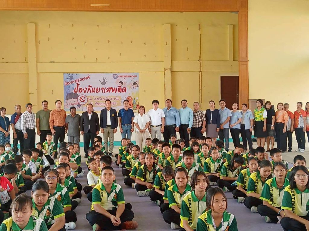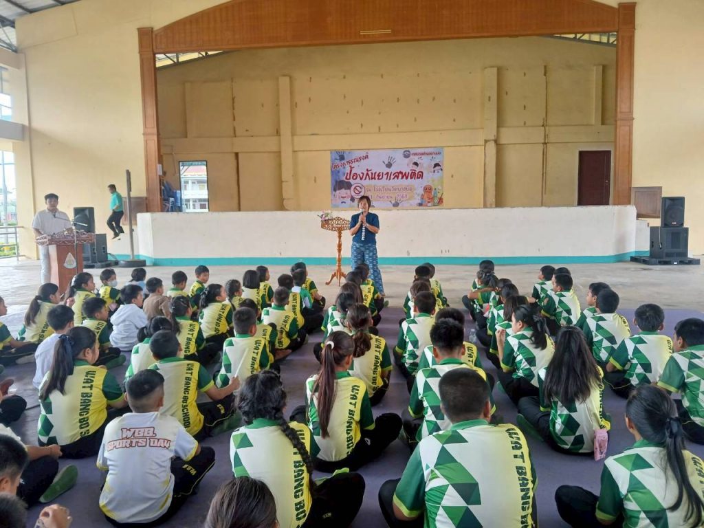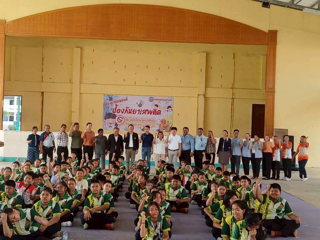 ณ หอประชุมโรงเรียนวัดบางบ่อ เพื่อสร้างกระแสนิยมในกลุ่มเยาวชนไม่ยุ่งเกี่ยวกับยาเสพติด และให้ความรู้ ความเข้าใจ