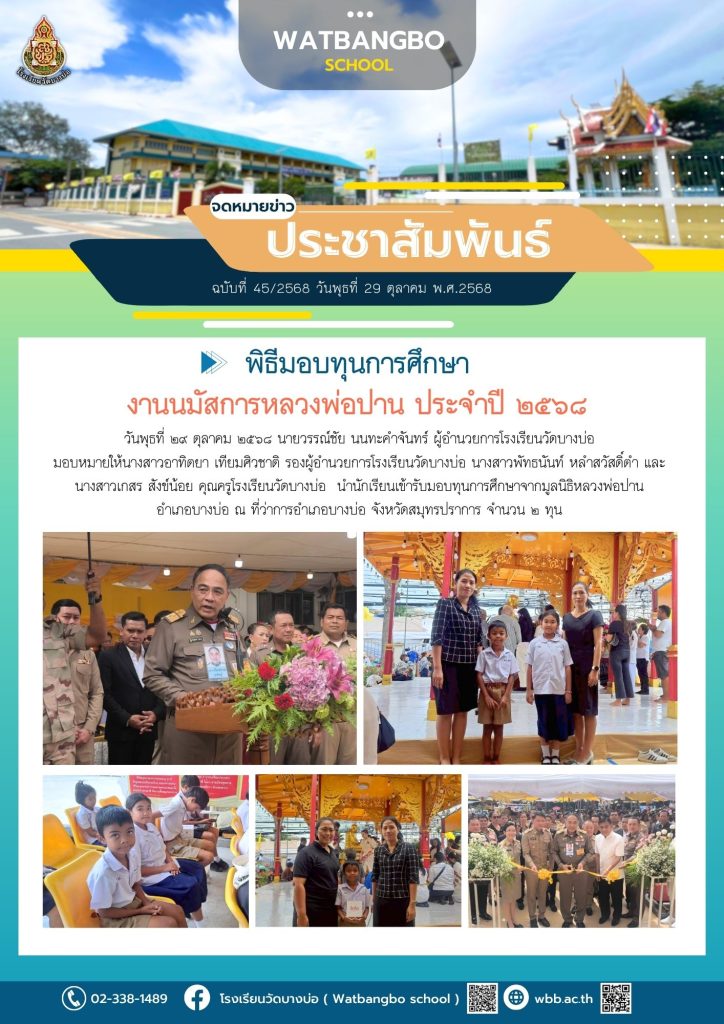 วันพุธที่ ๒๙ ตุลาคม ๒๕๖๘ นายวรรณ์ชัย นนทะคำจันทร์ ผู้อำนวยการโรงเรียนวัดบางบ่อมอบหมายให้นางสาวอาทิตยา เทียมศิวชาติ รองผู้อำนวยการโรงเรียนวัดบางบ่อ นางสาวพัทธนันท์ หลำสวัสดิ์ตำ และนางสาวเกสร สังข์น้อย คุณครูโรงเรียนวัดบางบ่อ นำนักเรียนเข้ารับมอบทุนการศึกษาจากมูลนิธิหลวงพ่อปานอำเภอบางบ่อ ณ ที่ว่าการอำเภอบางบ่อ จังหวัดสมุทรปราการ จำนวน ๒ ทุน
