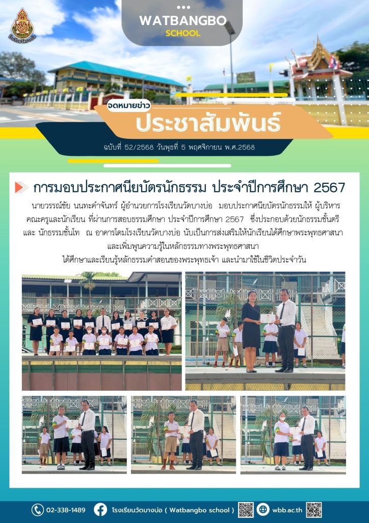 นายวรรณ์ชัย นนทะคำจันทร์ ผู้อำนวยการโรงเรียนวัดบางบ่อ มอบประกาศนียบัตรนักธรรมให้ ผู้บริหารคณะครูและนักเรียน ที่ผ่านการสอบธรรมศึกษา ประจำปีการศึกษา 2567 ซึ่งประกอบด้วยนักธรรมชั้นตรีและ นักธรรมชั้นโท ณ อาคารโดมโรงเรียนวัดบางบ่อ นับเป็นการส่งเสริมให้นักเรียนได้ศึกษาพระพุทธศาสนาและเพิ่มพูนความรู้ในหลักธรรมทางพระพุทธศาสนาได้ศึกษาและเรียนรู้หลักธรรมคำสอนของพระพุทธเจ้า และนำมาใช้ในชีวิตประจำวัน