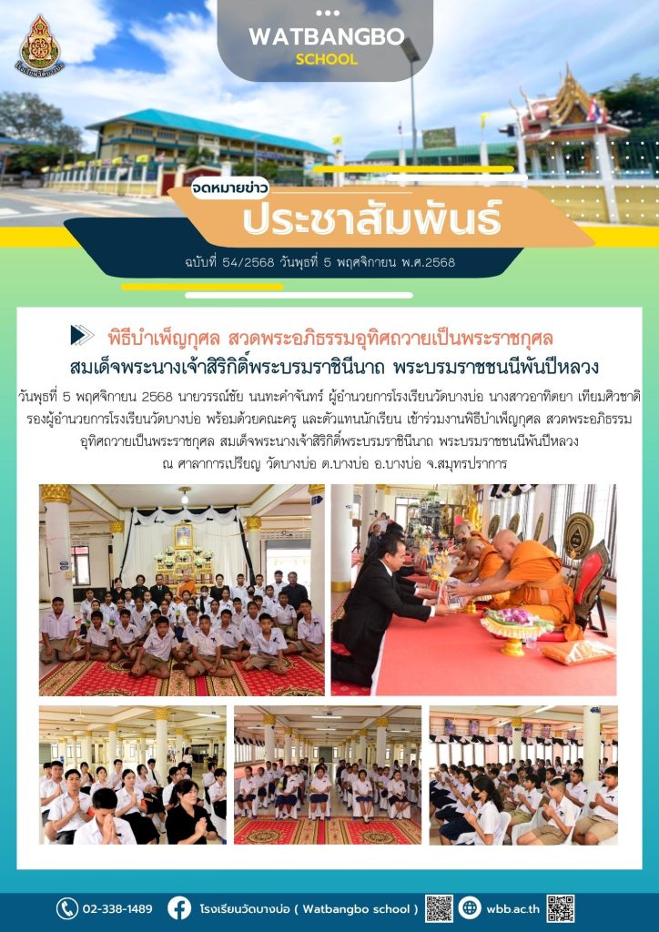 วันพุธที่ 5 พฤศจิกายน 2568 นายวรรณ์ชัย นนทะคำจันทร์ ผู้อำนวยการโรงเรียนวัดบางบ่อ นางสาวอาทิตยา เทียมศิวชาติ รองผู้อำนวยการโรงเรียนวัดบางบ่อ พร้อมด้วยคณะครู และตัวแทนนักเรียน เข้าร่วมงานพิธีบำเพ็ญกุศล สวดพระอภิธรรมอุทิศถวายเป็นพระราชกุศล สมเด็จพระนางเจ้าสิริกิติ์พระบรมราชินีนาถ พระบรมราชชนนีพันปีหลวง ณ ศาลาการเปรียญ วัดบางบ่อ ต.บางบ่อ อ.บางบ่อ จ.สมุทรปราการ