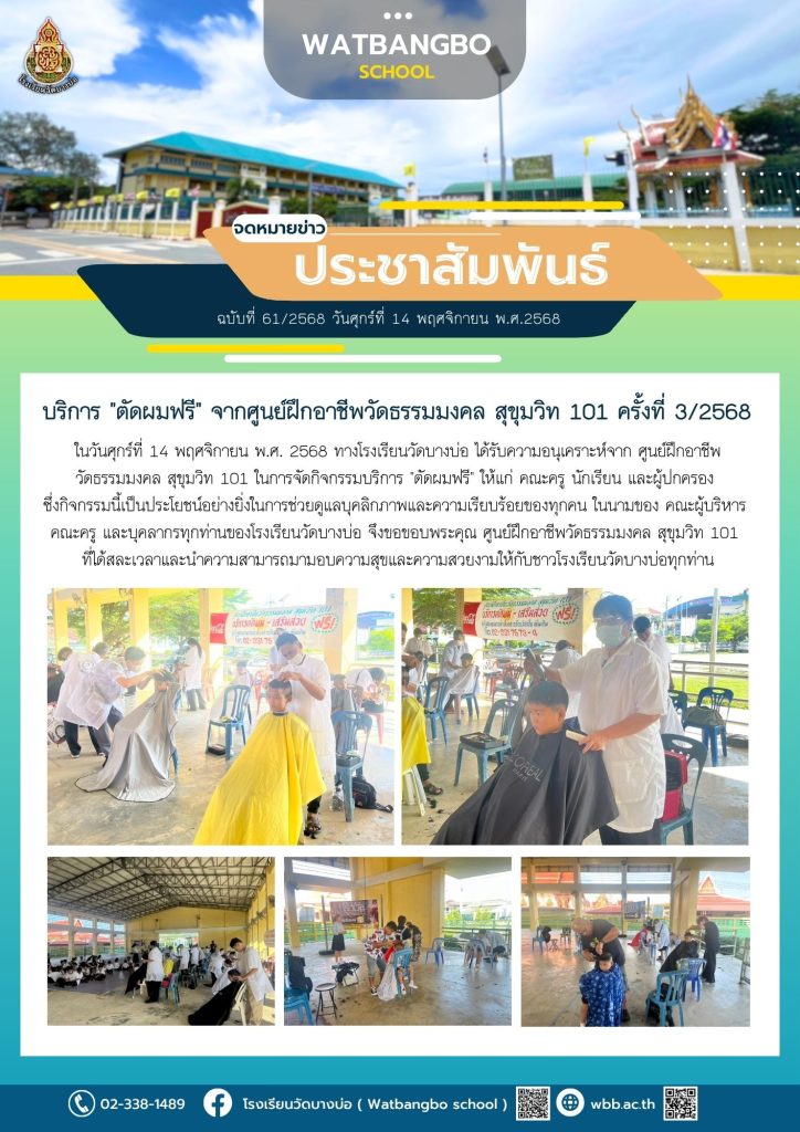ในวันศุกร์ที่ 14 พฤศจิกายน พ.ศ. 2568 ทางโรงเรียนวัดบางบ่อ ได้รับความอนุเคราะห์จาก ศูนย์ฝึกอาชีพวัดธรรมมงคล สุขุมวิท 101 ในการจัดกิจกรรมบริการ “ตัดผมฟรี” ให้แก่ คณะครู นักเรียน และผู้ปกครองซึ่งกิจกรรมนี้เป็นประโยชน์อย่างยิ่งในการช่วยดูแลบุคลิกภาพและความเรียบร้อยของทุกคน ในนามของ คณะผู้บริหารคณะครู และบุคลากรทุกท่านของโรงเรียนวัดบางบ่อ จึงขอขอบพระคุณ ศูนย์ฝึกอาชีพวัดธรรมมงคล สุขุมวิท 101ที่ได้สละเวลาและนำความสามารถมามอบความสุขและความสวยงามให้กับชาวโรงเรียนวัดบางบ่อทุกท่าน